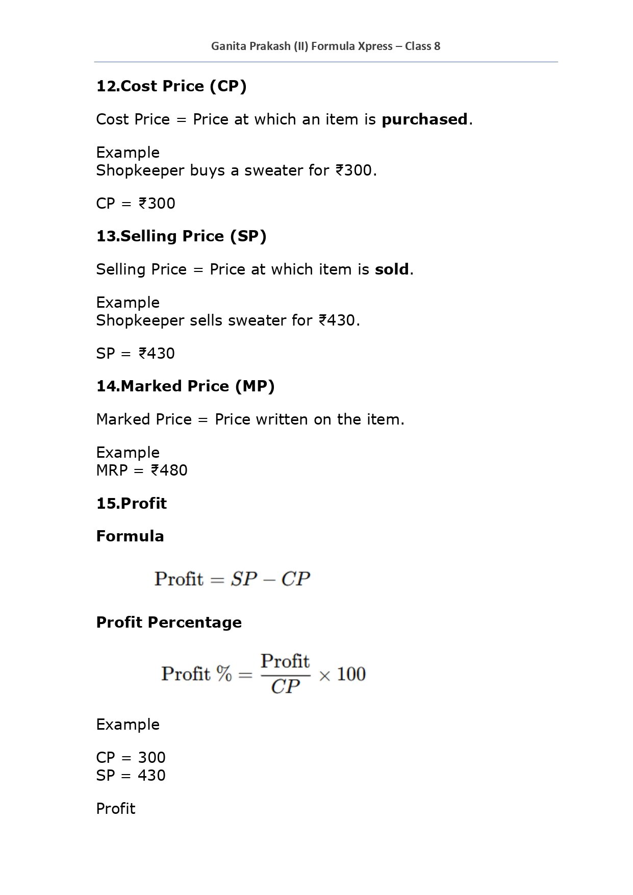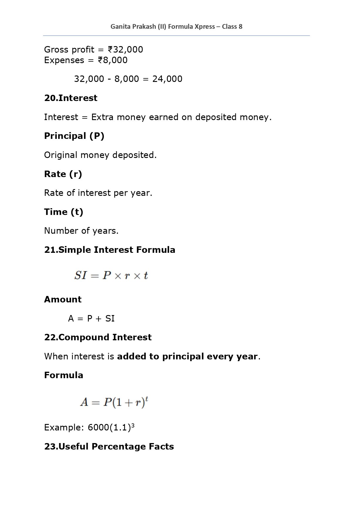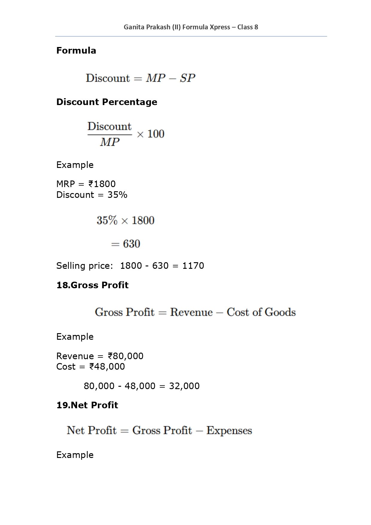 For example, Chapter 1 (page 4–14) includes complete coverage of percentages, profit loss, discount, and interest formulas, while later chapters include geometry formulas, algebra tricks, and data handling concepts, making it a complete revision toolkit.